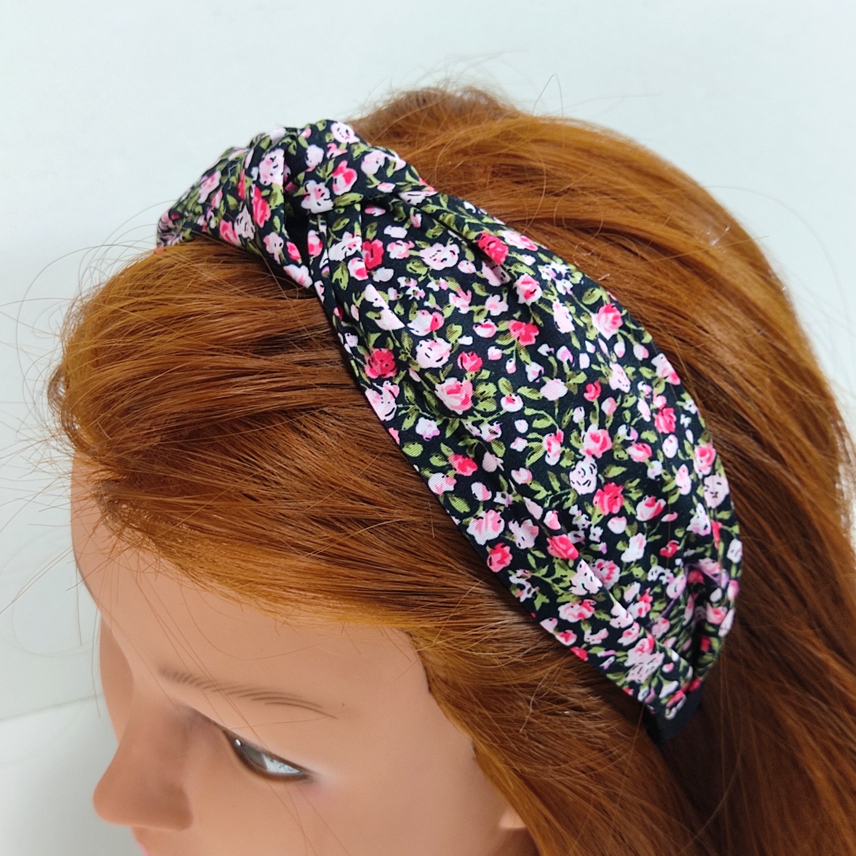 Στέκα με κόμπο από βαμβακερό ύφασμα φλοράλ σε μαύρο φόντο.